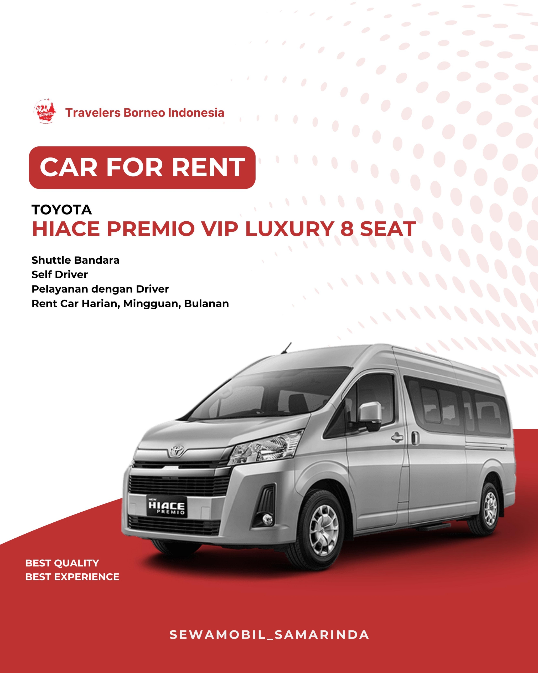Kami berkomitmen untuk memberikan layanan terbaik, kendaraan kondisi prima, driver profesional dan pengalaman, keramahan, kebersihan serta kenyamanan anda .